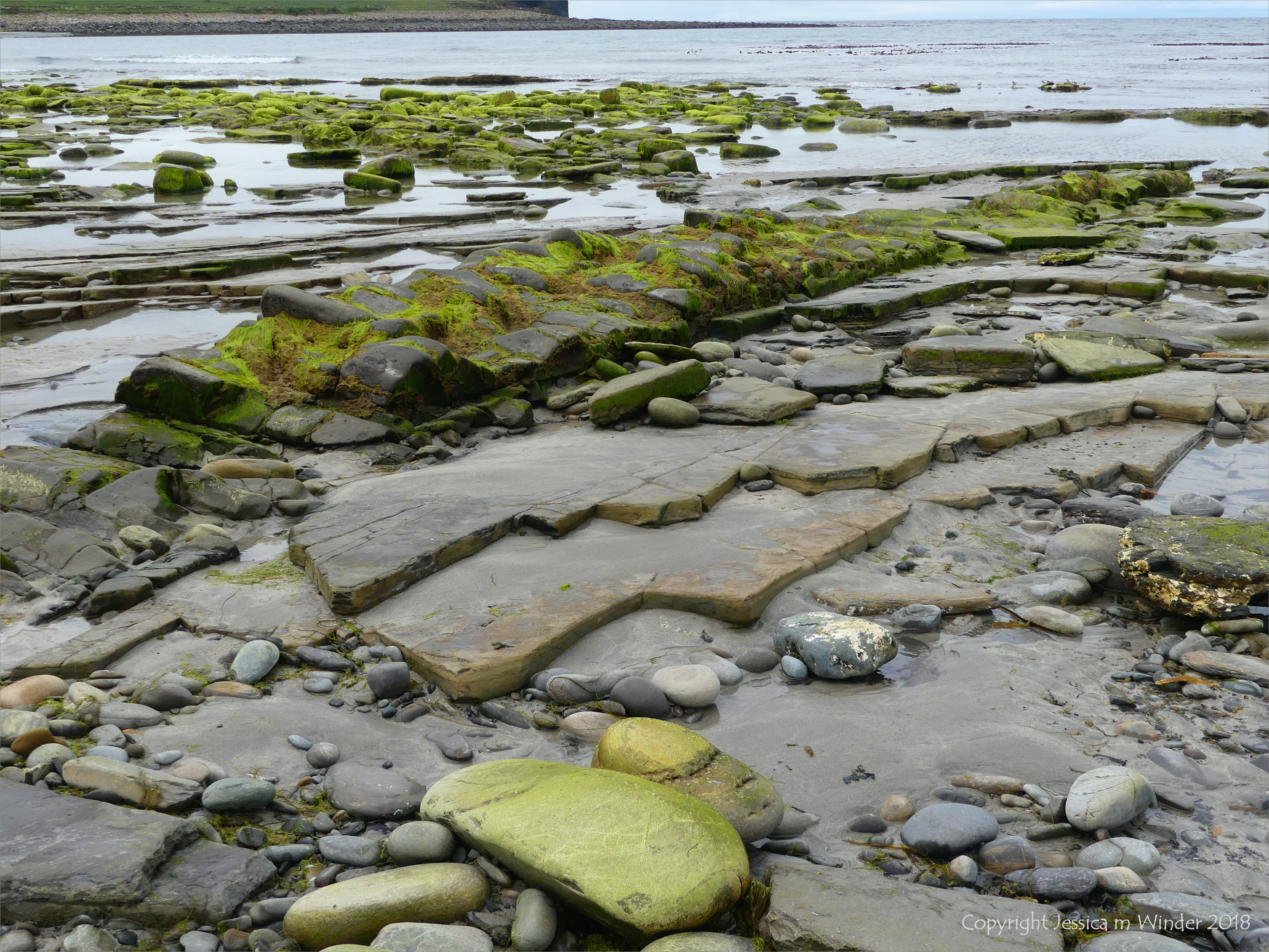 Bay of Skaill 17 – A harder algal-covered ridge of stone curves across the flagstone bedrock at Bay of Skaill in Orkney. Perhaps this is one of the intrusive camptonite dikes mentioned in the geology books.