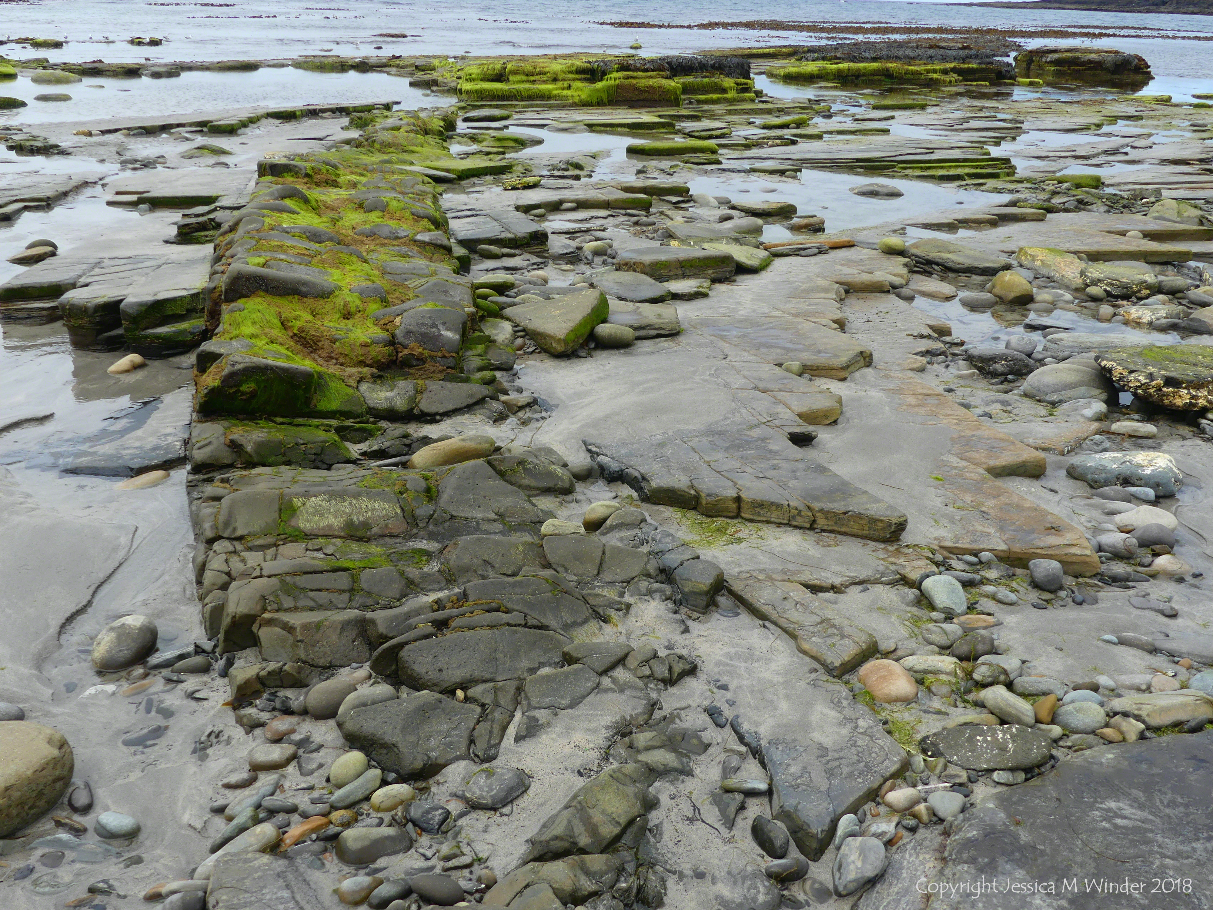 Bay of Skaill 19 – A harder algal-covered ridge of stone curves across the flagstone bedrock at Bay of Skaill in Orkney. Perhaps this is one of the intrusive camptonite dikes mentioned in the geology books.