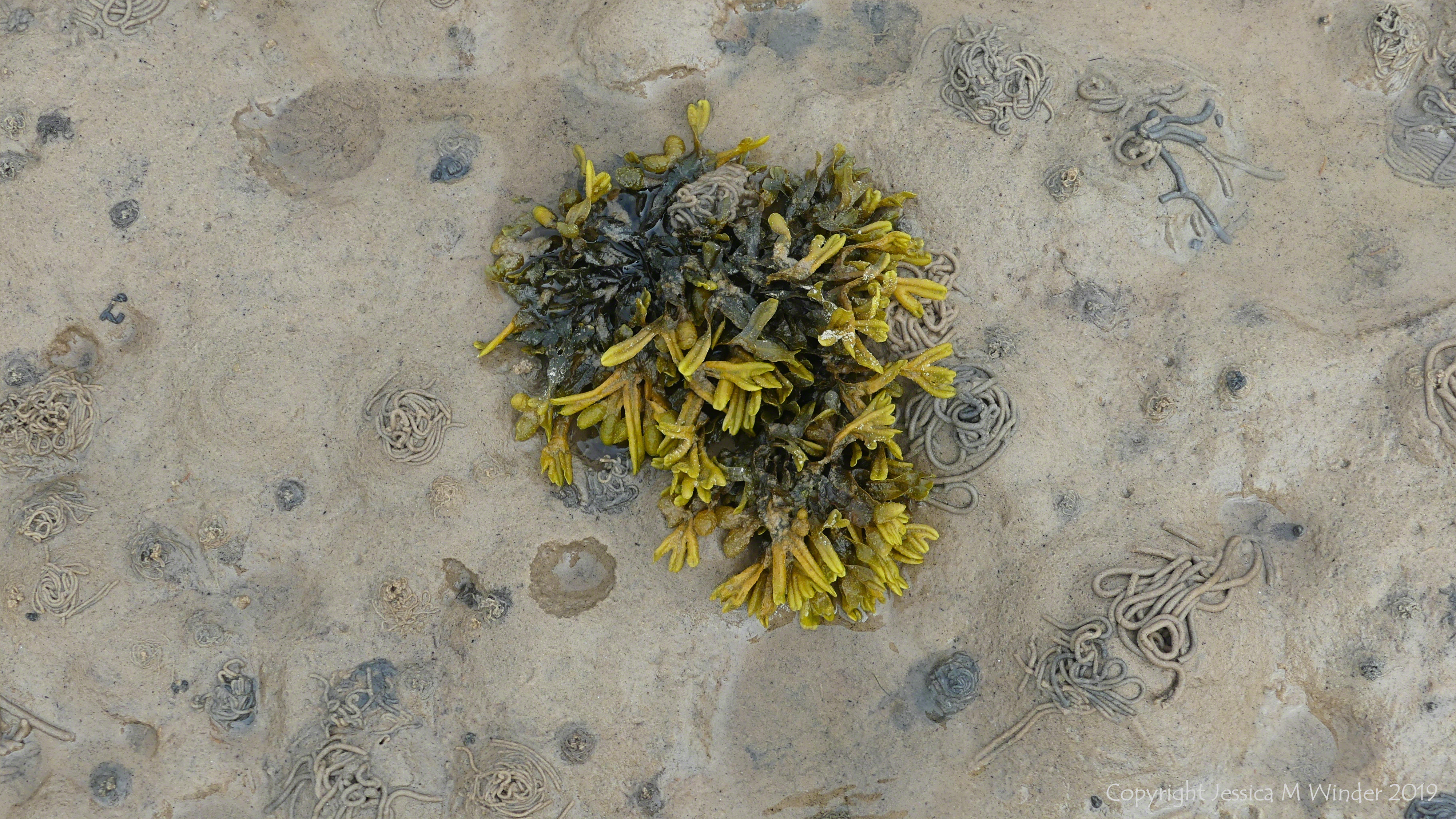 Seaweeds at Waulkmill Bay 3 – Seaweeds and lugworm casts on the sandy shore at Waulkmill Bay in Orkney East Mainland, June 2018