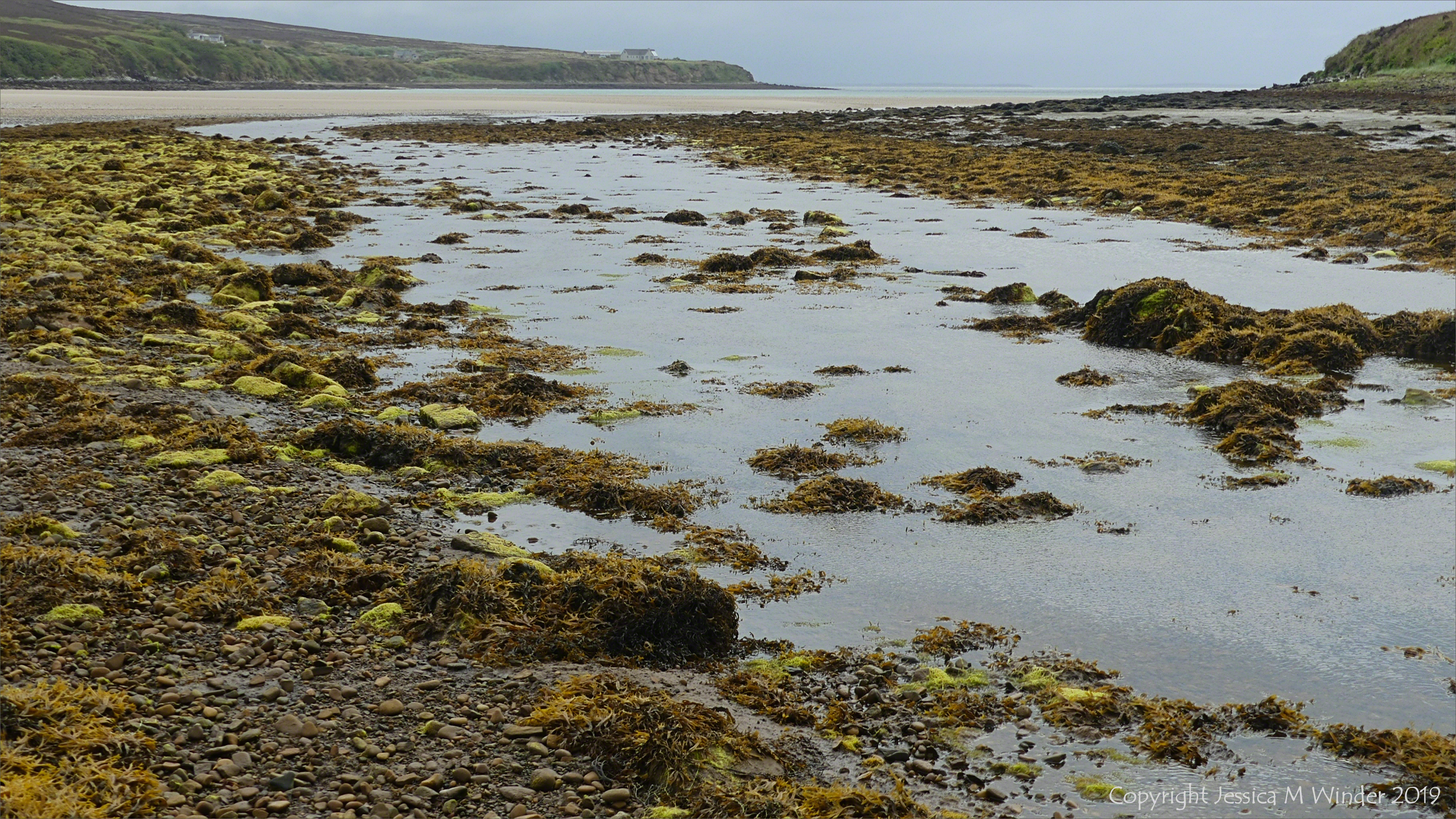 Seaweeds at Waulkmill Bay 8 – Horned or Estuary Wrack (Fucus ceranoides) and other marine algae growing on rocks at the west side of Waulkmill Bay where Mill Burn flows across the shore after draining down from Loch Kirbister and Skaith saltmarsh. Orkney West Mainland June 2018.