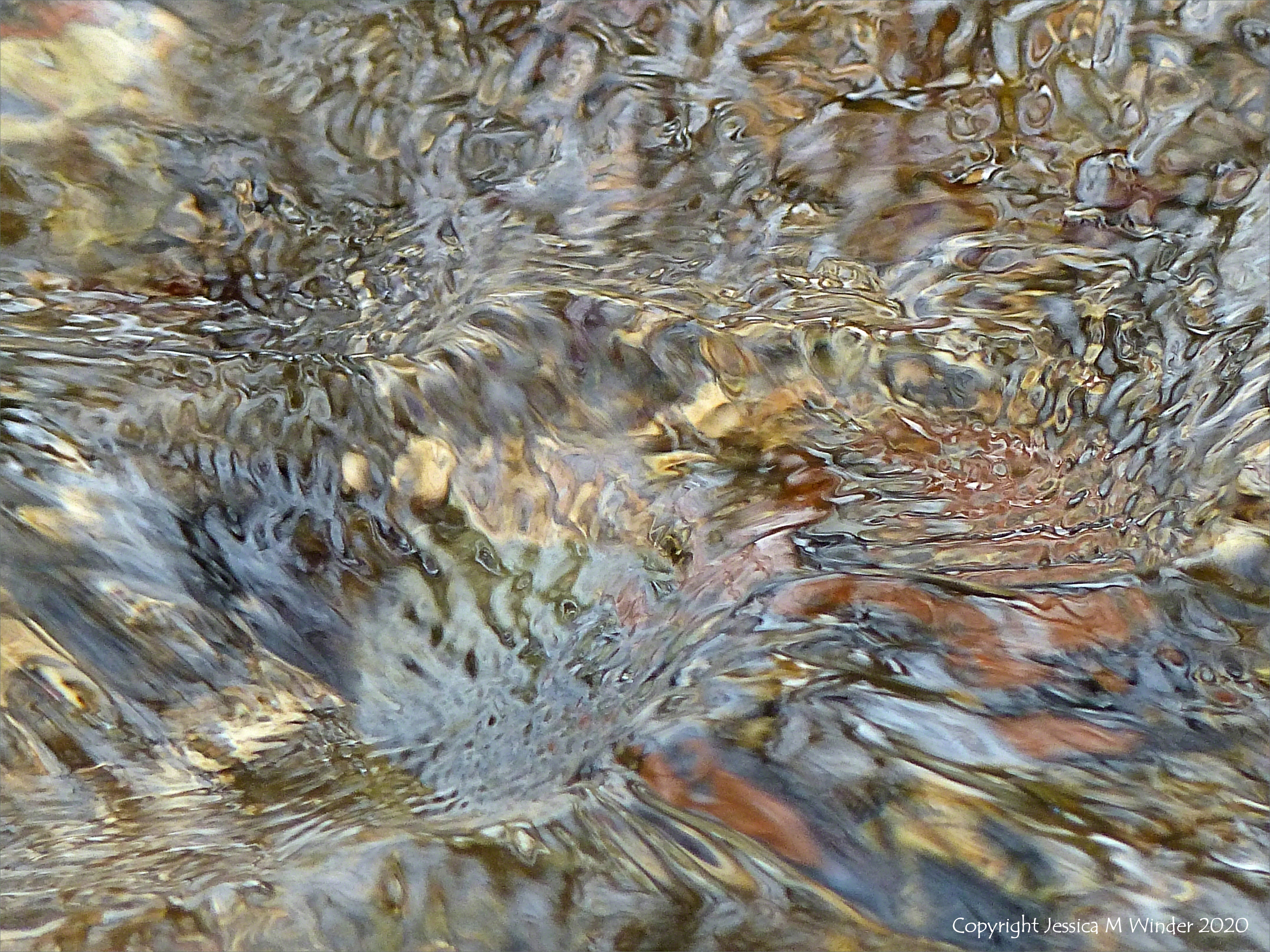 Close-up details of pattern and texture in the rippled surface of the fast flowing shallow chalk River Cerne in Dorset.