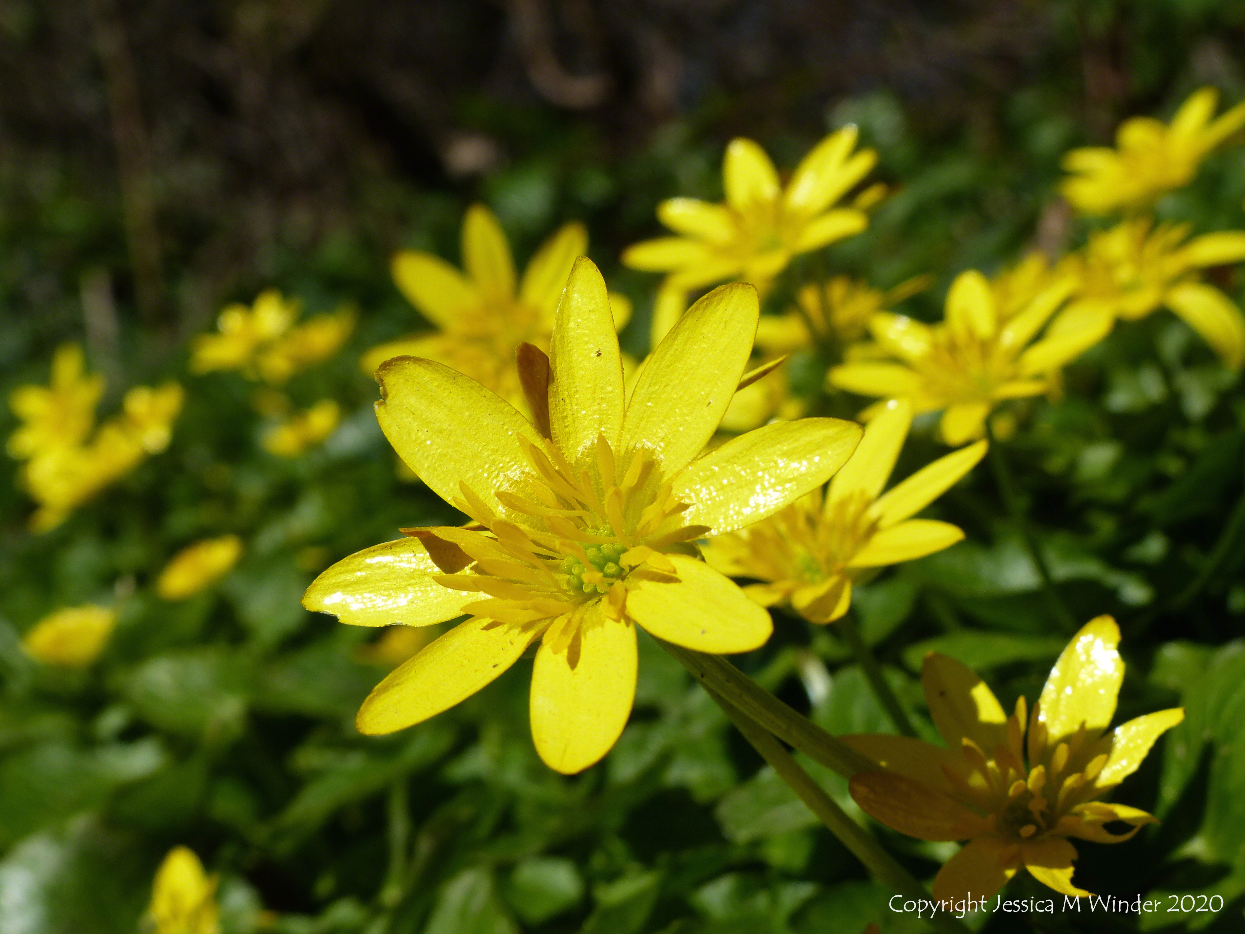Yellow flowers of Lesser Celandine (Ranunculus ficaria) in the English countryside