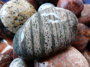 A green grey pebble of volcanic rock with stripes and dots from Corsica. P1100469a A green grey pebble of volcanic rock with stripes and dots from Corsica.