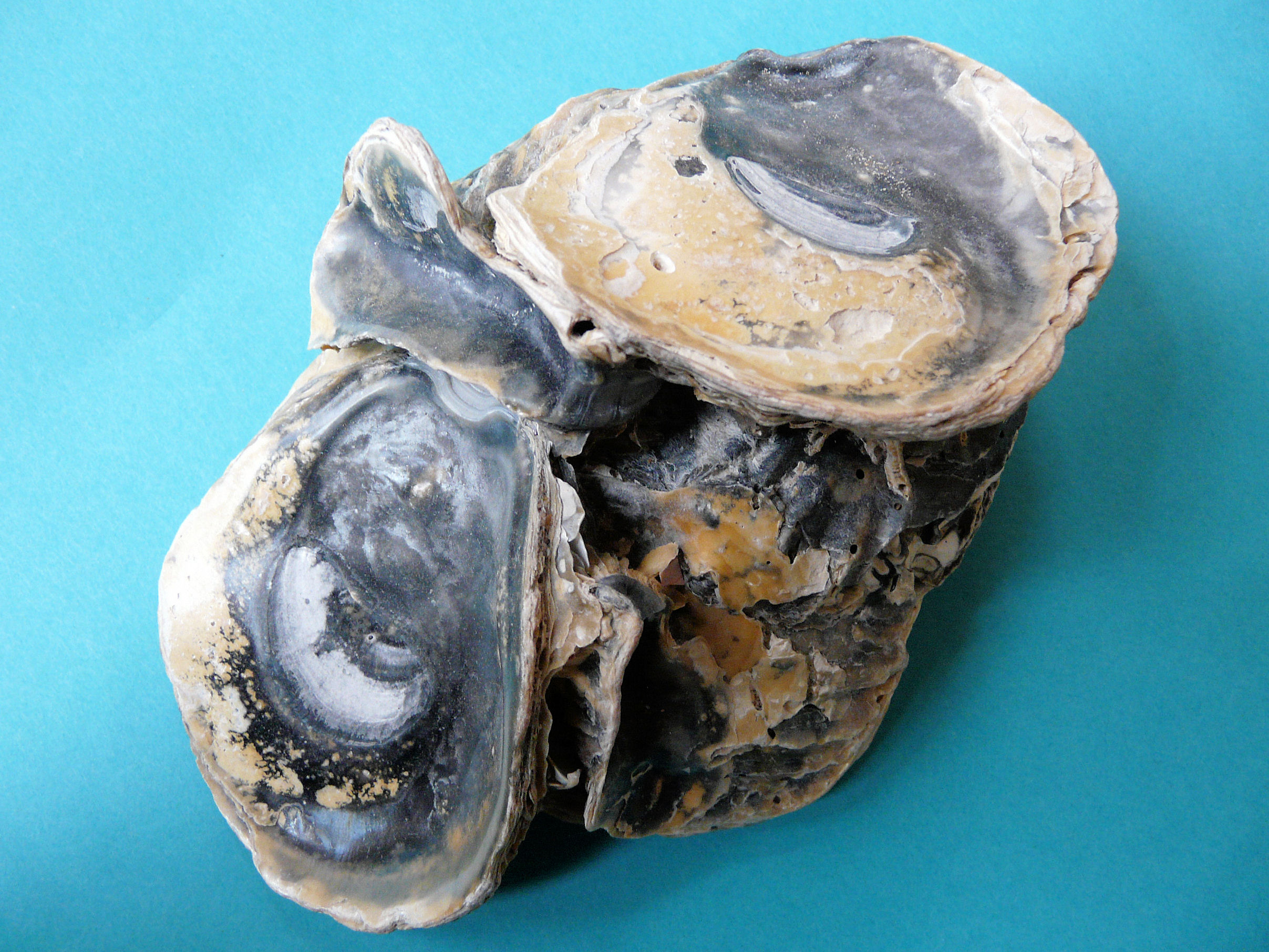 Clump One View 2 of five Flat Oyster shells (Ostrea edulis Linnaeus) attached to each other. P1150208a Clump One View 2 of five Flat Oyster shells (Ostrea edulis Linnaeus) attached to each other.