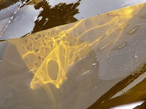 P1250154a A fleeting pattern of golden dappled sunlight on a blade of kelp at Ringstead Bay, Dorset, UK – part of the Jurassic Coast (3)